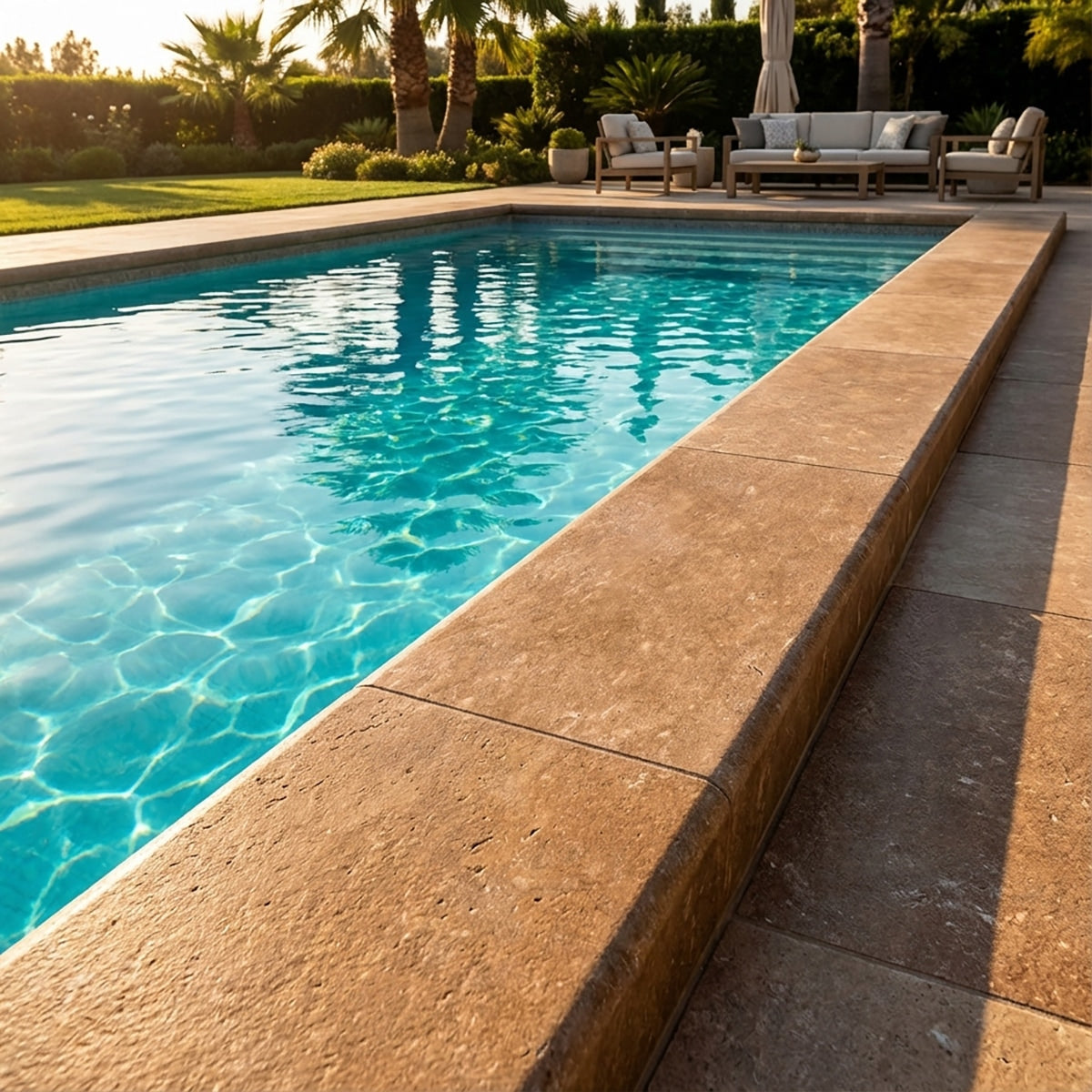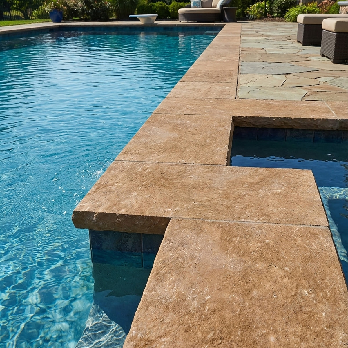 The Noce Tumbled 12x24 Travertine Extra Thick Modern Edge Coping brings a rustic, earthy charm to any outdoor project. Its rich brown tones and durable design make it ideal for pool surrounds, steps, and pathways, providing a stylish yet resilient finish.