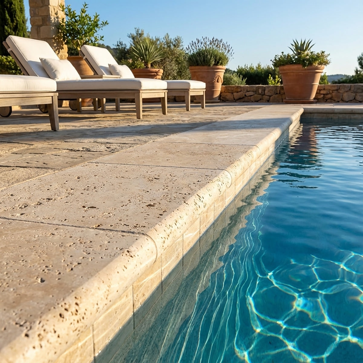 Enhance the edges of your pool or steps with the Philadelphia Tumbled 12x24 Travertine Thick Bullnose Coping. This coping features warm, earthy tones and a tumbled finish, offering a smooth, rounded bullnose edge that’s both safe and attractive. The thick design adds durability and a solid feel, making it perfect for creating elegant and long-lasting outdoor spaces. Ideal for adding a touch of rustic charm to your landscape.